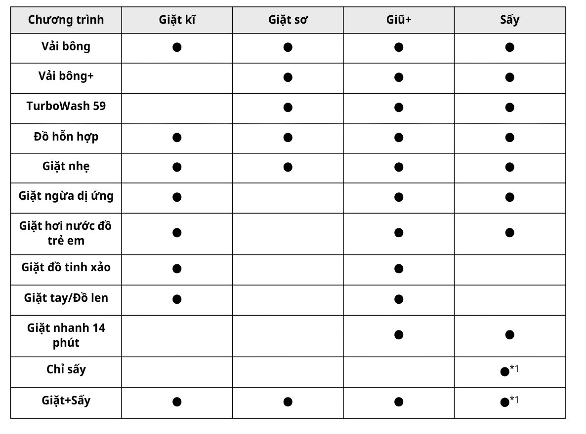 Lưu ý: Giặt Sấy( ):( ) hiển thị công suất sấy thay đổi theo mẫu máy.