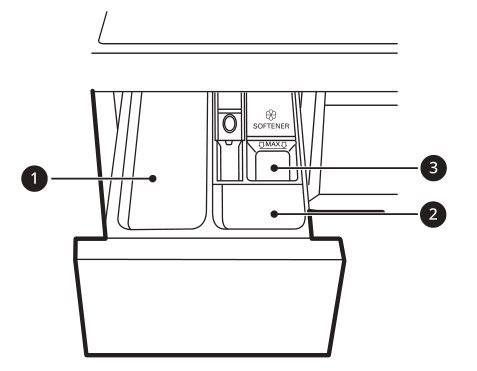 1 – Ngăn đựng chất tẩy để giặt chính. Chất tẩy để giặt chính, nước xả, chất tẩy