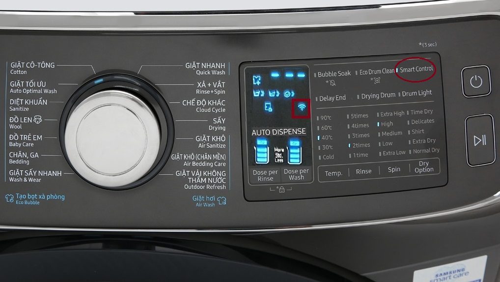 Trên ứng dụng SmartThings thông báo “nhấn Smart Control trên máy giặt để kết nối”,;Bạn hãy nhấn vào Smart Control trên bảng điều khiển máy giặt để đèn báo sáng ở Smart Control và biểu tượng Wifi.