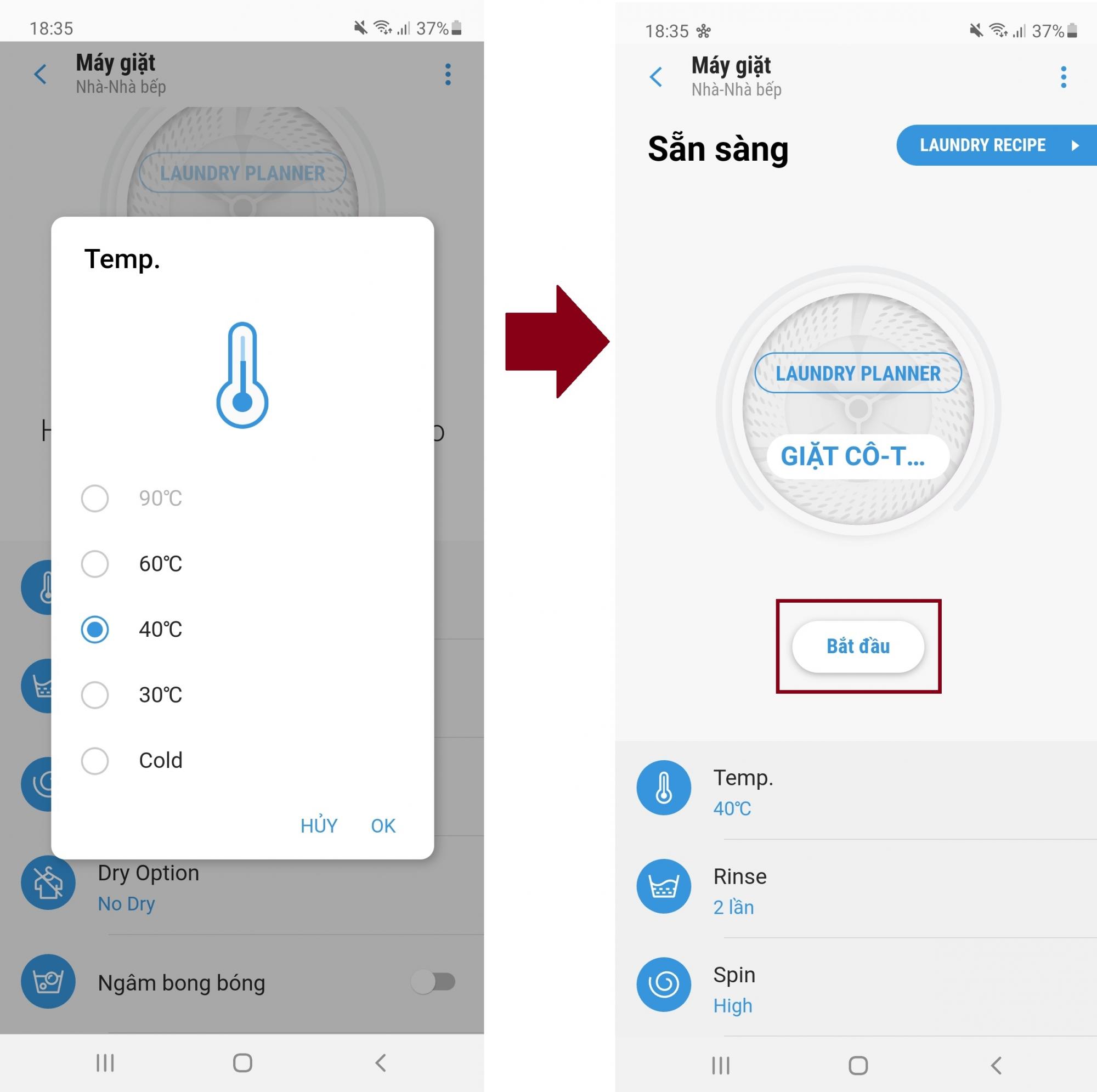 Lúc này, máy giặt bắt đầu hoạt động chu trình giặt theo cài đặt điều khiển từ điện thoại qua SmartThings.