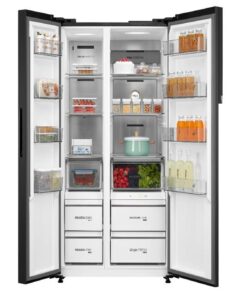 – Tủ lạnh side by side với chất liệu cửa tủ là kính nên mang đến sự tinh tế và hiện đại cho không gian. Phần tay cầm có thiết kế âm ẩn nên nhìn chiếc tủ giống như một khối liền mạch mang đến sự gọn gàng.